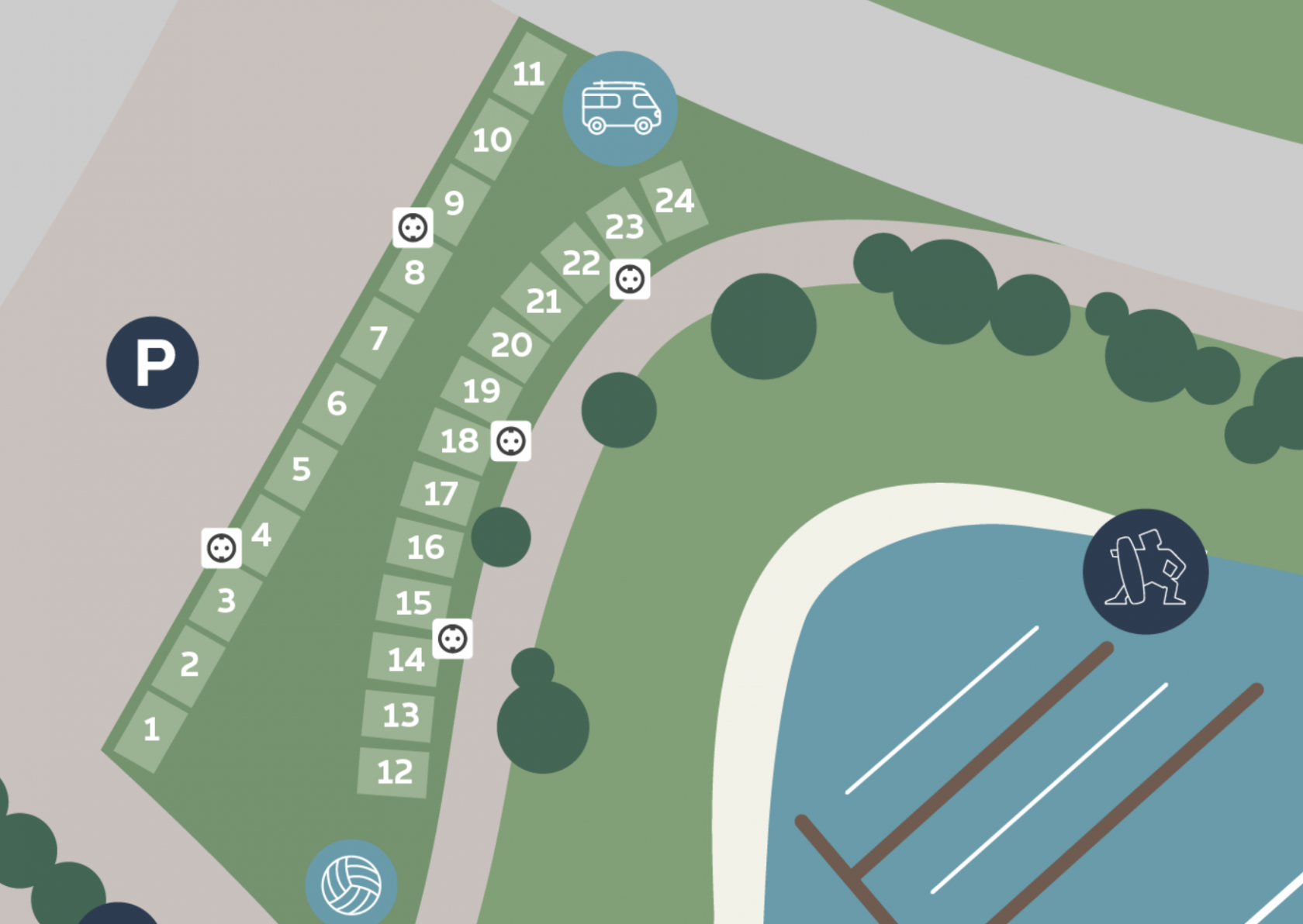 Wähle deinen eigenen Stellplatz, alle sind mit Strom ausgestattet. Bitte beachte: Eine Buchung ist nur in Verbindung mit einem gültigen Wakeboardticket zulässig.